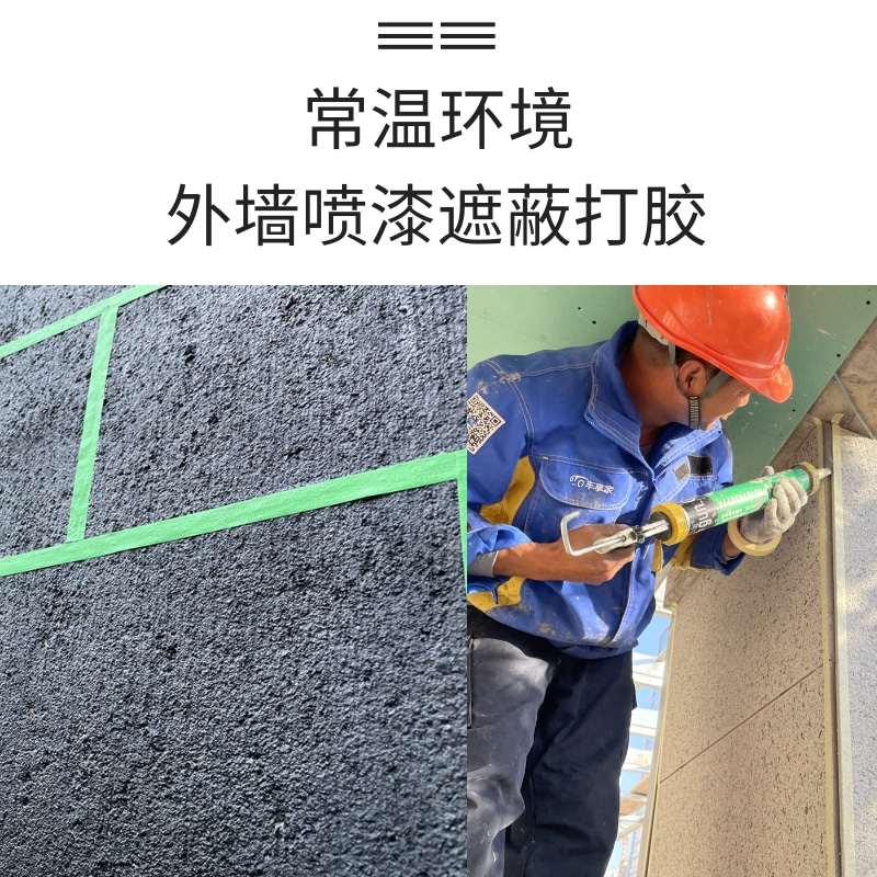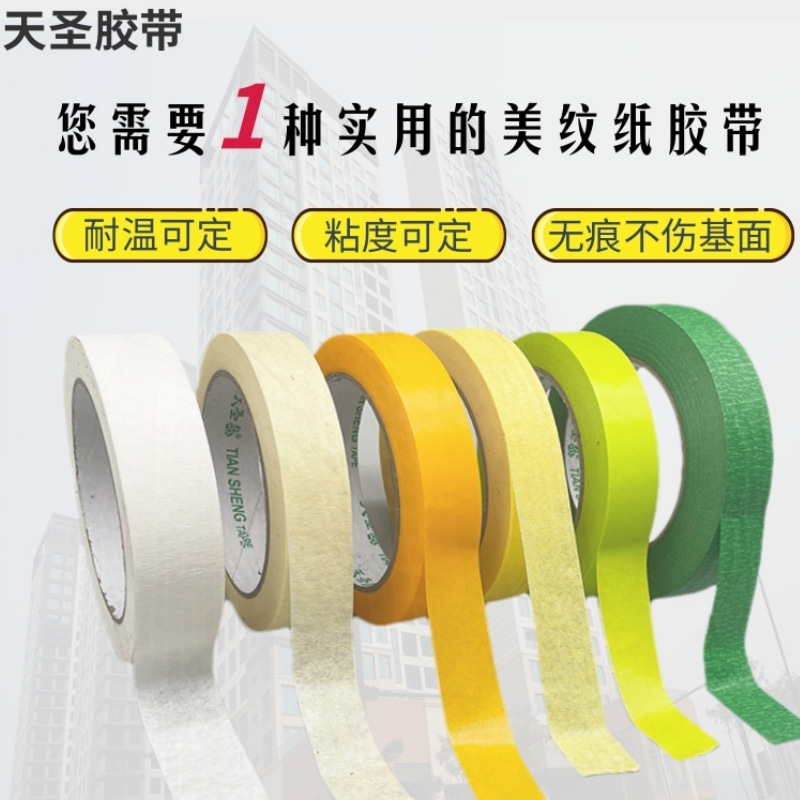 天圣彩色美纹纸产品说明: 基材:皱纹纸 胶性:橡胶型胶水 规格:宽度6mm-1200mm任切 长度10米-50米任选 颜色:红、橙、绿、绿黄、黄、淡黄、白 特性:耐温、防渗透、遮蔽效果好 服务:免费索样 质保:2年