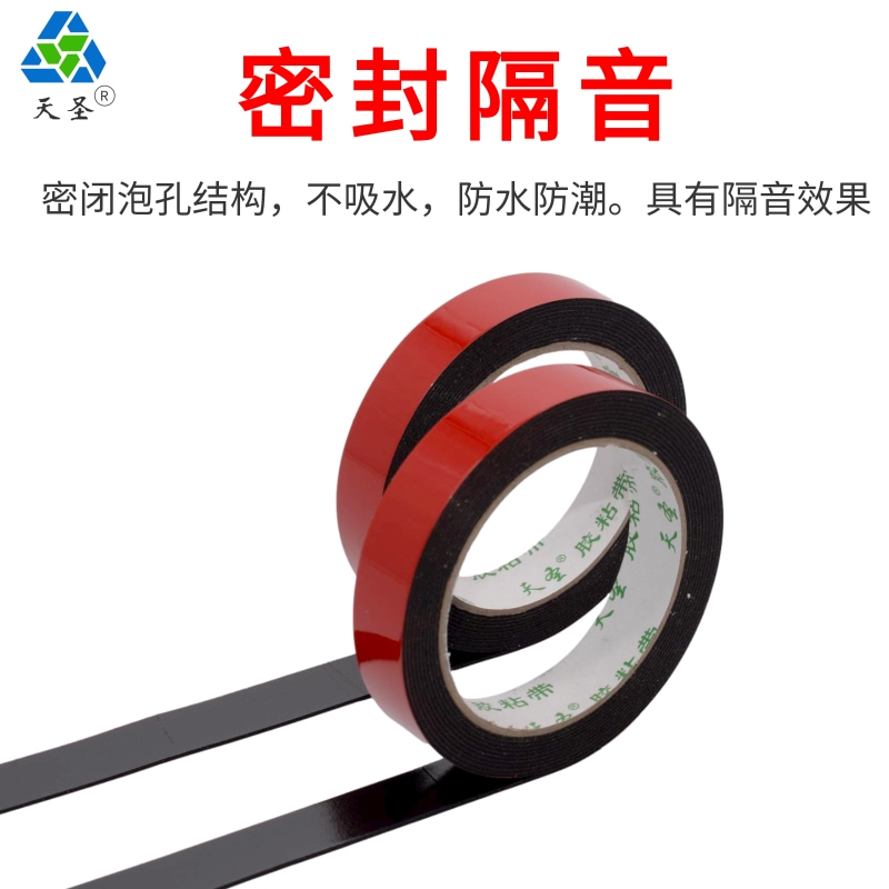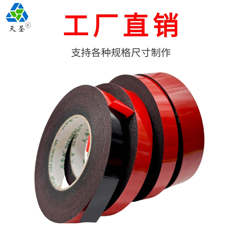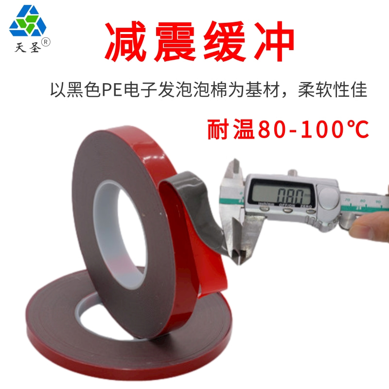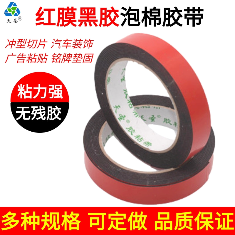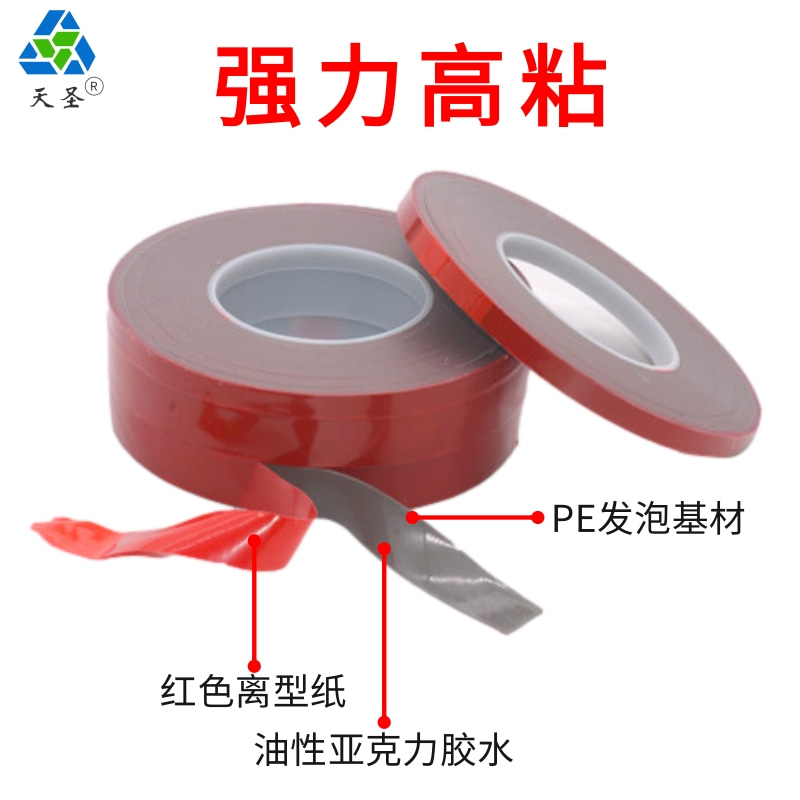 天圣强力双面胶产品说明: 基材:丙烯酸泡棉基材 规格:形状任意冲型 颜色:透明、灰色 特性:耐温防水更持久 用途:汽车标牌、电子产品加固