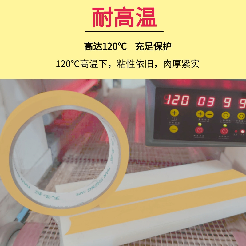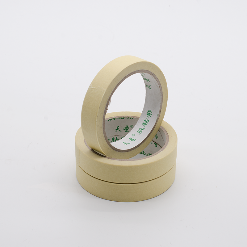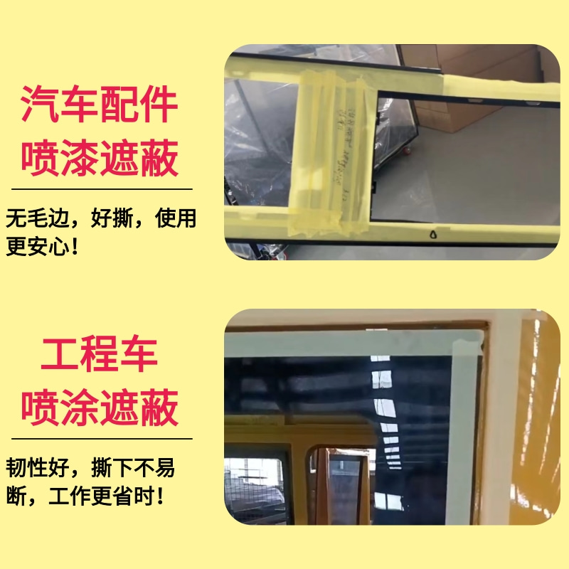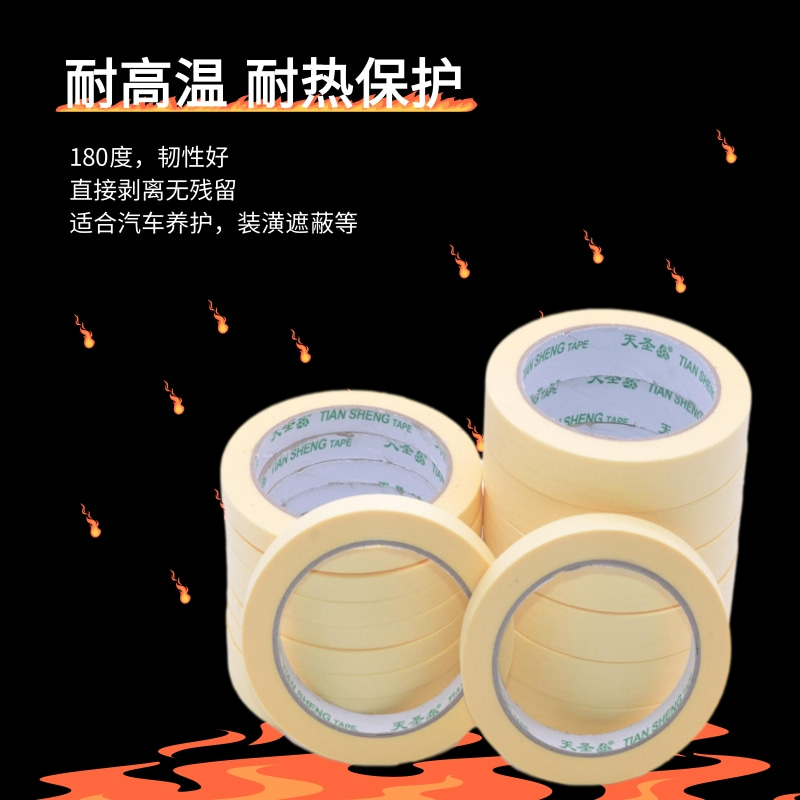 天圣汽车美纹纸产品说明: 基材:皱纹纸 胶性:橡胶型胶水 规格:宽度6mm-1200mm任切 长度10米-50米任选 颜色:淡黄 特性:耐温、不残胶、防渗透、遮蔽效果好 服务:免费索样 质保:2年
